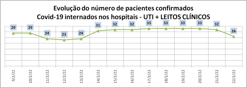 A ocupação de leitos clínicos destinados para o atendimento à infecção pelo novo coronavírus é de 9,70% – queda em relação aos 11,19% da segunda-feira (21/2). São 13 pacientes internados. Dez são confirmados para a Covid-19, sendo seis em Parobé; dois em Igrejinha; e dois em São Francisco de Paula. Há ainda três pacientes suspeitos para a Covid-19 internados, sendo dois em Parobé e um em Três Coroas.
