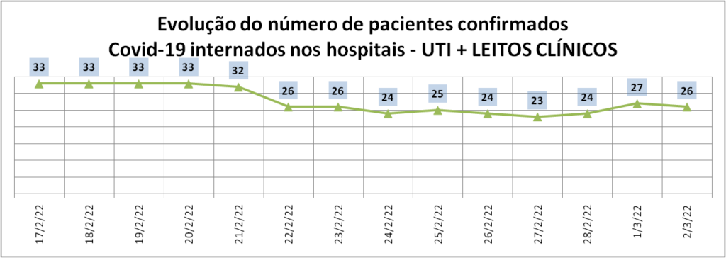 A ocupação de leitos clínicos destinados para o atendimento à infecção pelo novo coronavírus é de 8,21% – queda em relação aos 9,70% da terça-feira (1/3). São 11 pacientes internados. Nove são confirmados para a Covid-19, sendo sete em Parobé; um em Cambará do Sul; e um em Três Coroas. Há ainda dois pacientes suspeitos para a Covid-19 internados em Parobé.