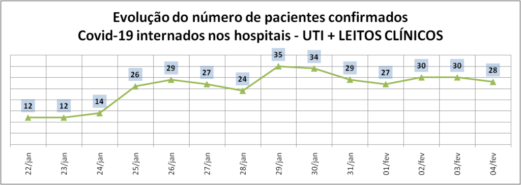 A ocupação de leitos clínicos destinados para o atendimento à infecção pelo novo coronavírus é de 5,22% – queda em relação aos 8,96% da quinta-feira (3/2). São sete pacientes internados, todos confirmados para a Covid-19. Quatro estão em Parobé; dois em Rolante; e um em Três Coroas.