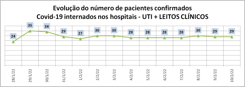A ocupação de leitos clínicos destinados para o atendimento à infecção pelo novo coronavírus é de 6,72% – mesmo índice da quarta-feira (9/2). São nove pacientes internados. Sete são confirmados para a Covid-19, sendo quatro em Parobé; um em Igrejinha; um em Rolante; e um em São Francisco de Paula. Outros dois são suspeitos para a Covid-19 e estão em Parobé.