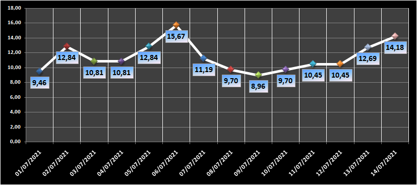 Gráfico da ocupação de leitos de UTI nos últimos 14 dias.