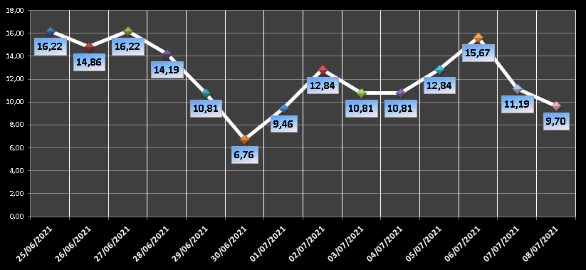 Gráfico da ocupação de leitos clínicos nos últimos 14 dias