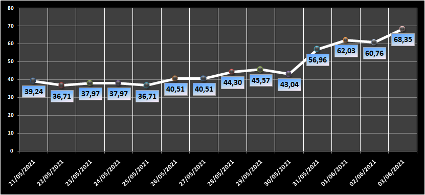 Gráfico da ocupação de UTIs nos últimos 14 dias