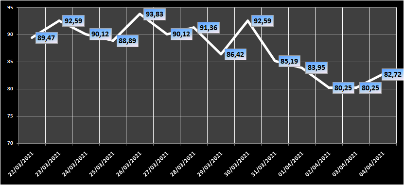 A Rádio Taquara divulga, diariamente, os dados da ocupação hospitalar na região, conforme as informações das casas de saúde repassadas ao governo do Estado. Nos relatórios deste domingo (4/4), colhidos às 20h30min pela reportagem, a ocupação somada das três Unidades de Terapia Intensiva (UTIs), de Igrejinha, Parobé e Taquara, é de 82,72% – aumento em relação aos 80,25% do sábado (3/4). São 67 pacientes internados, sendo 65 confirmados para Covid-19 e dois suspeitos.