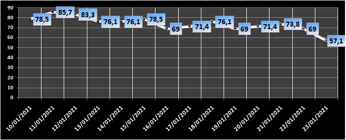 A Rádio Taquara divulga, diariamente, os dados da ocupação hospitalar na região, conforme as informações das casas de saúde repassadas ao governo do Estado. Nos relatórios deste sábado (23/1), colhidos às 22 horas pela reportagem, a ocupação somada das duas Unidades de Terapia Intensiva (UTIs), de Parobé e Taquara, é de 57,1% – queda em relação aos 69% da sexta-feira (22/1). São 24 pacientes internados, sendo 22 confirmados para Covid-19 e dois suspeitos para Covid-19 ou Síndrome Respiratória Aguda Grave (SRAG).