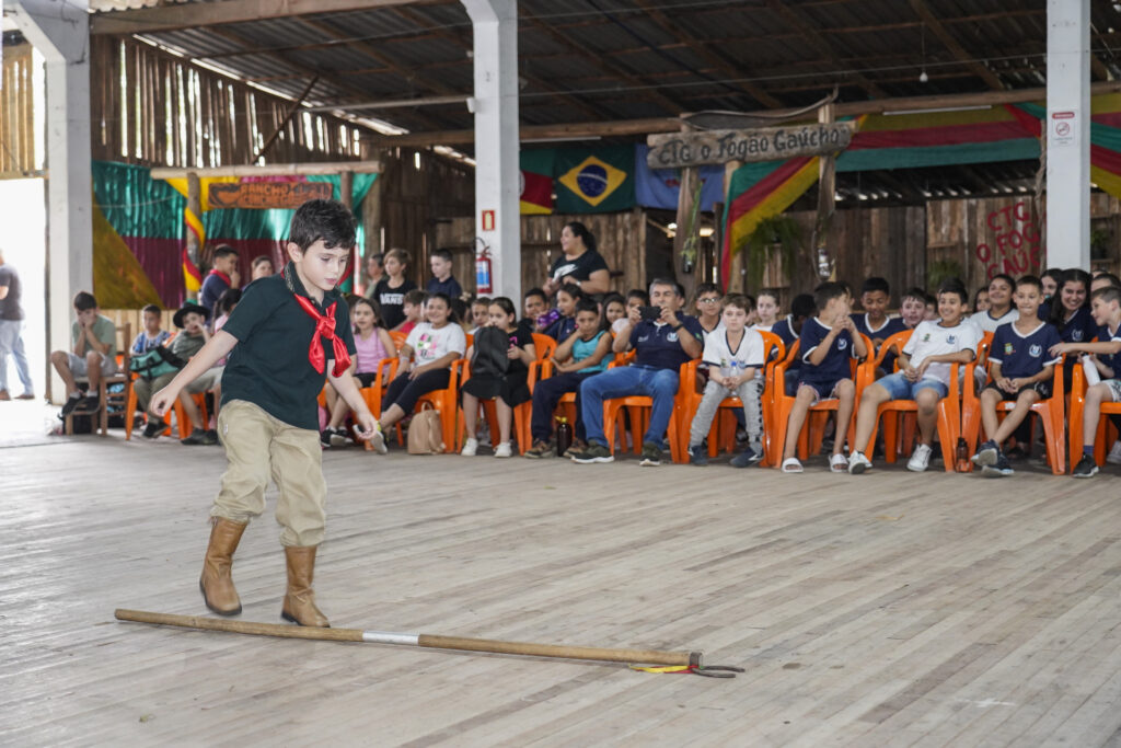 Canceladas devido ao mau tempo que assolou a região na semana passada, as oficinas culturais foram retomadas, na segunda-feira (18), pela organização do 15º Festejos Farroupilhas do Paranhana, em conjunto com a Secretaria de Educação, Cultura e Esporte (Smece). Vaca Parada, andar a cavalo, danças tradicionalistas, chula e guasqueiro foram algumas das atividades passadas às crianças por oficineiros ligados ao tradicionalismo gaúcho.