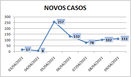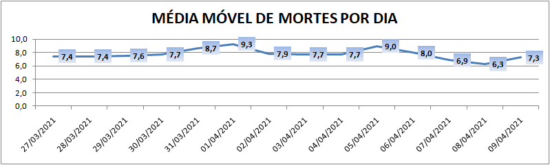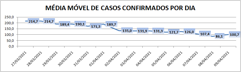 A média móvel de novos casos na região é de 100,7 por dia. Na comparação com o dado de sete dias atrás, a média móvel apresenta queda de 24%. Já com relação ao índice de 14 dias atrás, o valor é de 53% de queda no registro médio diário de casos.