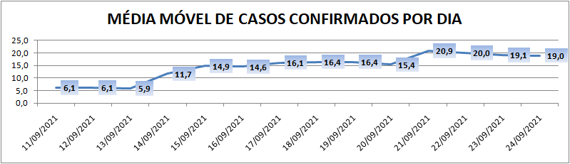 A média móvel de novos casos na região é de 19 por dia. Na comparação com o dado de sete dias atrás, a média móvel está em crescimento de 16%. Já com relação ao índice de 14 dias atrás a média móvel apresenta crescimento de 209%.