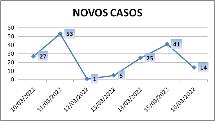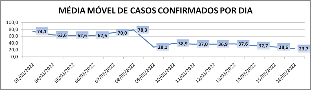A média móvel de novos casos na região é de 23,7 por dia. Com relação ao índice de 14 dias atrás a média móvel apresenta queda de 68%*.