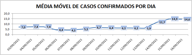 A média móvel de novos casos na região é de 14,6 por dia. Na comparação com o dado de sete dias atrás, a média móvel está em crescimento de 127%. Já com relação ao índice de 14 dias atrás a média móvel apresenta crescimento de 108%.