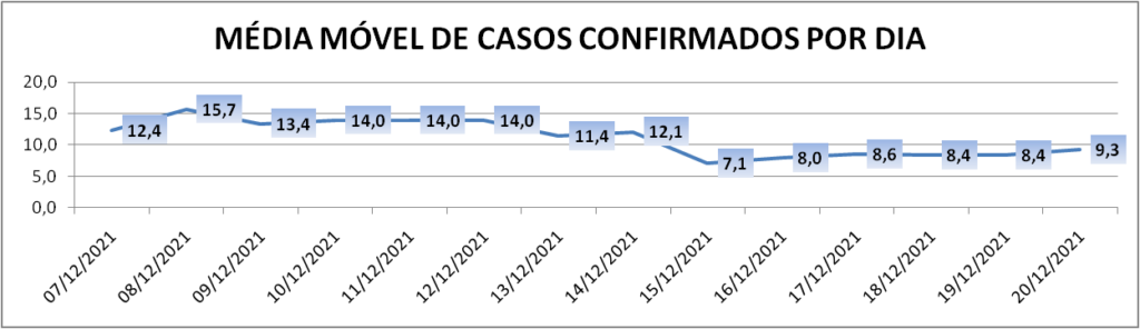 A média móvel de novos casos na região é de 9,6 por dia. Com relação ao índice de 14 dias atrás a média móvel apresenta queda de 25% – o que indica tendência de queda na pandemia*.