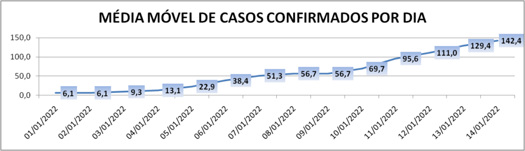 A média móvel de novos casos na região é de 142,4 por dia. Com relação ao índice de 14 dias atrás a média móvel apresenta crescimento de 2219%*.