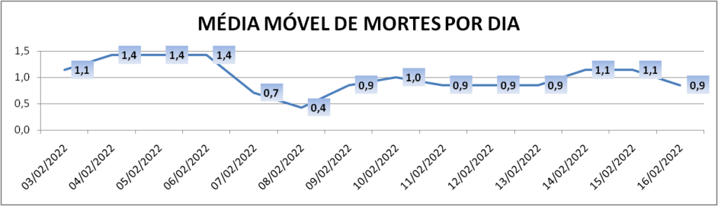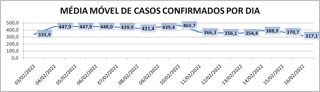 A média móvel de novos casos na região é de 317,1 por dia. Com relação ao índice de 14 dias atrás a média móvel apresenta queda de 6%* – o que indica tendência de estabilidade na pandemia.