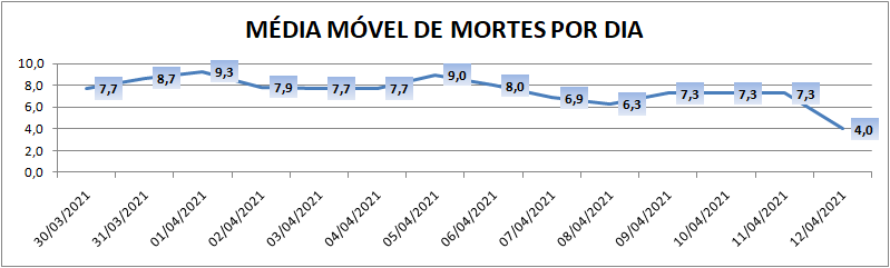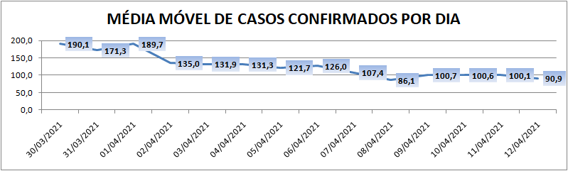A média móvel de novos casos na região é de 90,9 por dia. Na comparação com o dado de sete dias atrás, a média móvel apresenta queda de 28%. Já com relação ao índice de 14 dias atrás, o valor é de 52% de queda no registro médio diário de casos.