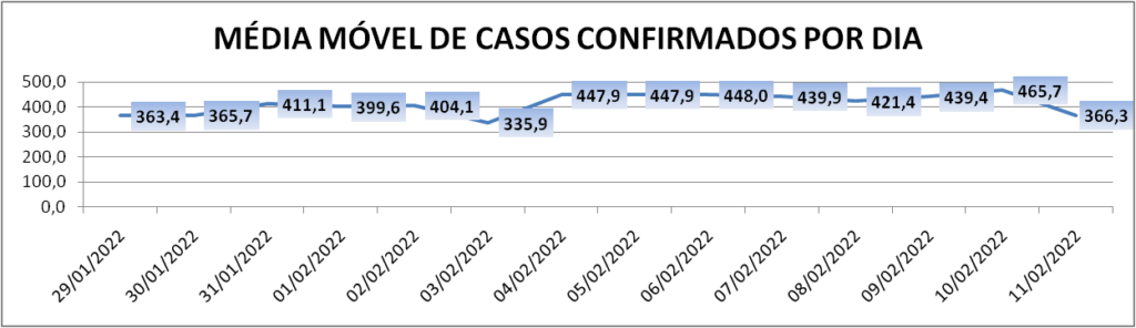 A média móvel de novos casos na região é de 366,3 por dia. Com relação ao índice de 14 dias atrás a média móvel apresenta crescimento de 1%* – o que indica tendência de estabilidade na pandemia.