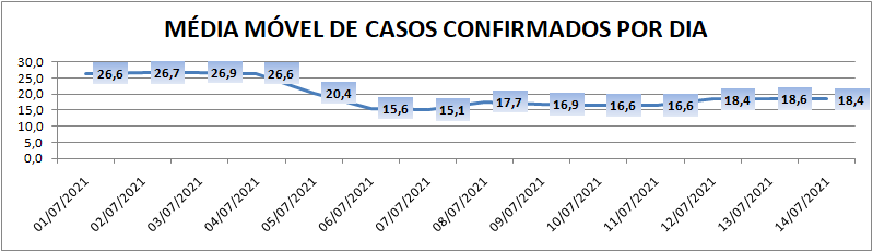 A média móvel de novos casos na região é de 18,4 por dia. Na comparação com o dado de sete dias atrás, a média móvel apresenta crescimento de 4%. Já com relação ao índice de 14 dias atrás a média móvel apresenta queda de 31%.
