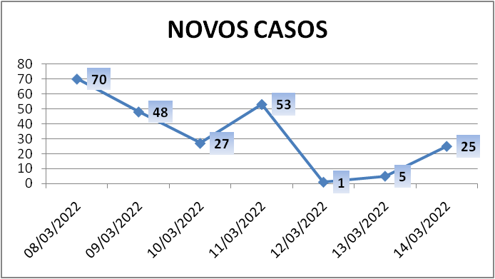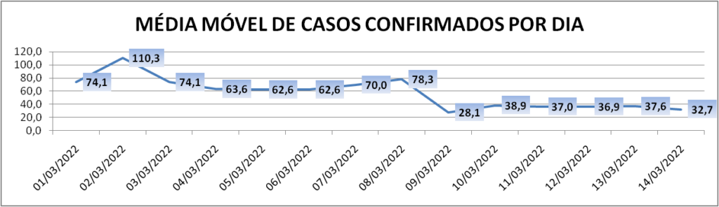 A média móvel de novos casos na região é de 32,7 por dia. Com relação ao índice de 14 dias atrás a média móvel apresenta queda de 56%*.