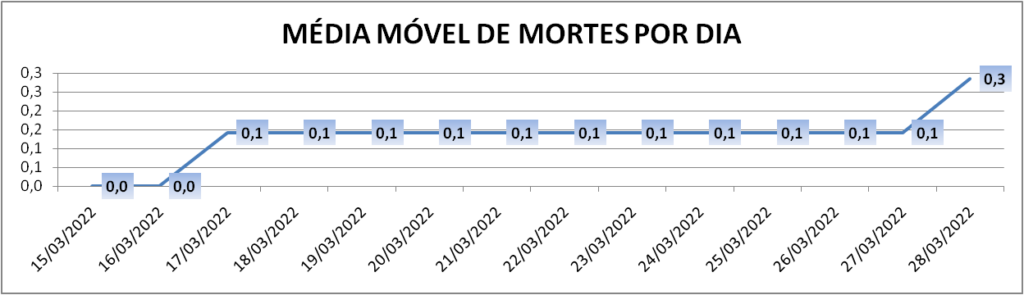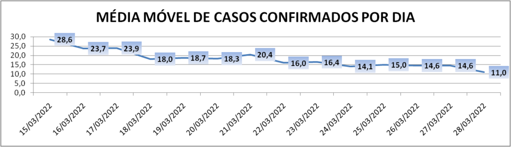 A média móvel de novos casos na região é de 11 por dia – a menor desde 3 de janeiro. Com relação ao índice de 14 dias atrás a média móvel apresenta queda de 62%*.