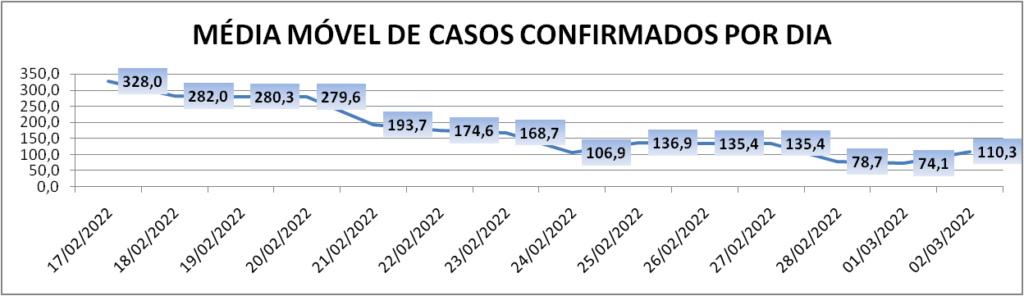 A média móvel de novos casos na região é de 110,3 por dia. Com relação ao índice de 14 dias atrás a média móvel apresenta queda de 66%*.
