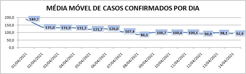 A média móvel de novos casos na região é de 92,9 por dia. Na comparação com o dado de sete dias atrás, a média móvel apresenta crescimento de 8%. Já com relação ao índice de 14 dias atrás, o valor é de 51% de queda no registro médio diário de casos.