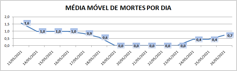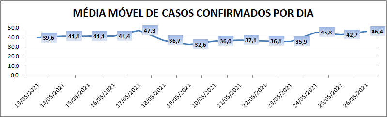 A média móvel de novos casos na região é de 46,4 por dia. Na comparação com o dado de sete dias atrás, a média móvel apresenta crescimento de 29%. Já com relação ao índice de 14 dias atrás, o valor é de 17% de crescimento no registro médio diário de casos.