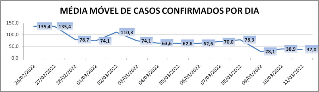 A média móvel de novos casos na região é de 37 por dia. Com relação ao índice de 14 dias atrás a média móvel apresenta queda de 73%*.
