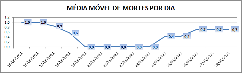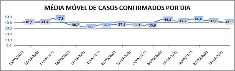 A média móvel de novos casos na região é de 41,3 por dia. Na comparação com o dado de sete dias atrás, a média móvel apresenta crescimento de 14%. Já com relação ao índice de 14 dias atrás a média móvel apresenta estabilidade – zero por cento de diferença.