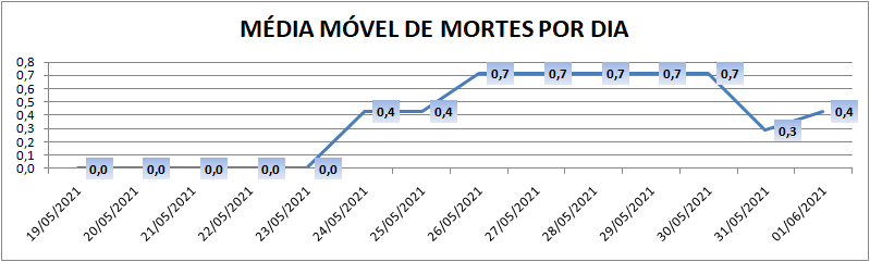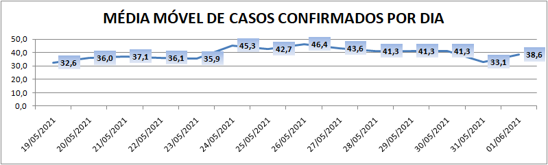 A média móvel de novos casos na região é de 38,6 por dia. Na comparação com o dado de sete dias atrás, a média móvel apresenta queda de 17%. Já com relação ao índice de 14 dias atrás a média móvel apresenta crescimento de 18%.