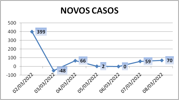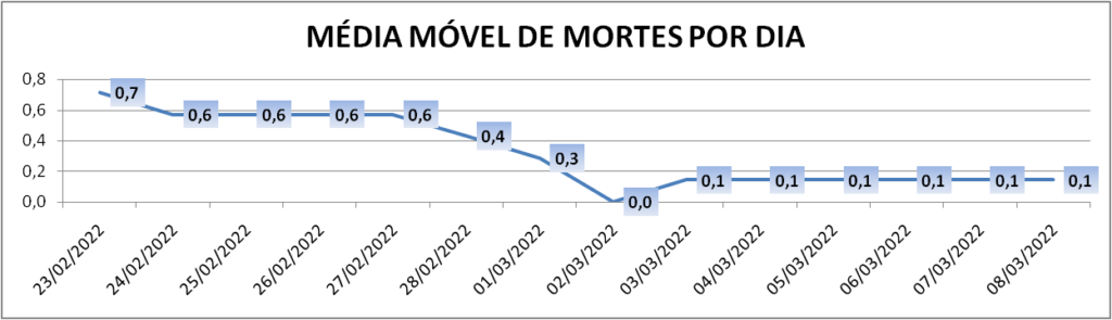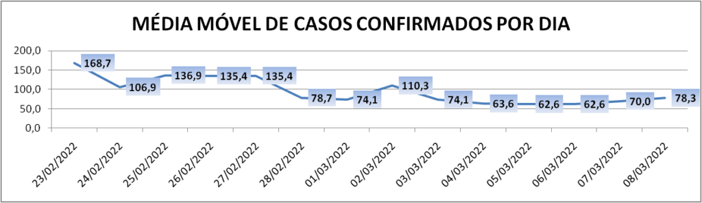 A média móvel de novos casos na região é de 78,3 por dia. Com relação ao índice de 14 dias atrás a média móvel apresenta queda de 54%*.