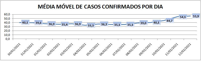 Em crescimento há cinco dias, a média móvel de novos casos na região é de 55,9 por dia. Na comparação com os últimos sete dias, a média móvel apresenta crescimento de 59%. Já com relação aos últimos 14 dias, o índice é de 39% de aumento no registro médio diário de casos.