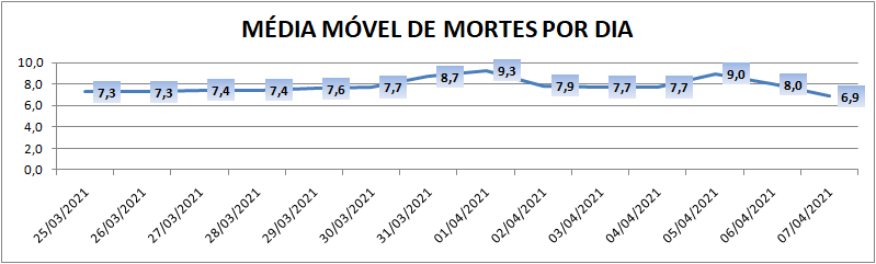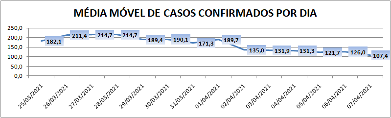 A média móvel de novos casos na região é de 107,4 por dia. Na comparação com o dado de sete dias atrás, a média móvel apresenta queda de 43%. Já com relação ao índice de 14 dias atrás, o valor é de 41% de queda no registro médio diário de casos.