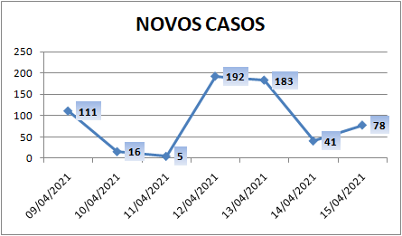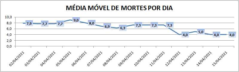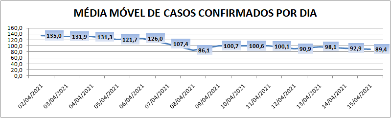A média móvel de novos casos na região é de 89,4 por dia. Na comparação com o dado de sete dias atrás, a média móvel apresenta queda de 11%. Já com relação ao índice de 14 dias atrás, o valor é de 34% de queda no registro médio diário de casos.