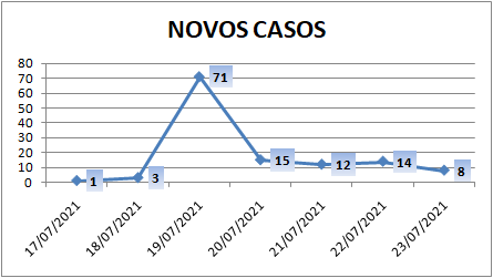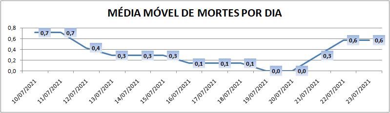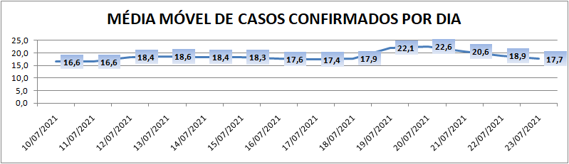 A média móvel de novos casos na região é de 17,7 por dia. Na comparação com o dado de sete dias atrás, a média móvel apresenta crescimento de 2%. Já com relação ao índice de 14 dias atrás a média móvel apresenta crescimento de 7%.
