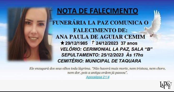 A Prefeitura de Parobé, por meio da Secretaria de Educação, em conjunto com a Escola Municipal de Educação Infantil (EMEI) Doce Mel, divulgou uma nota de pesar após o falecimento da professora Ana Paula de Aguiar Cemim, aos 37 anos, ocorrido no domingo (24), véspera de Natal.
