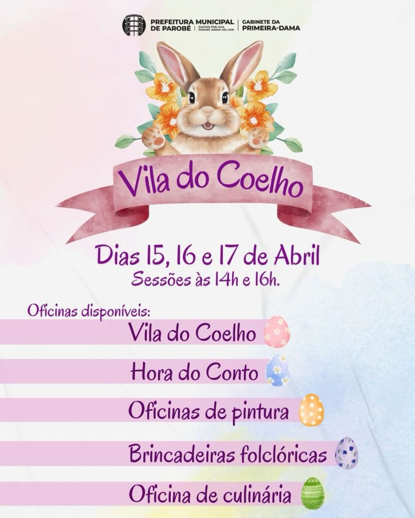 Nos dias 15, 16 e 17 de abril, a Rua Coberta da Praça 1º de Maio será invadida pelo espírito da Páscoa, com a instalação da Vila do Coelho. O local contará com decoração especial e uma programação especial com Hora do Conto, oficinas de pintura e criação de orelhinhas de coelho, além de brincadeiras folclóricas de Páscoa.