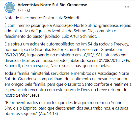 A associação Norte Sul-Rio-Grandense, região administrativa da Igreja Adventista do Sétimo Dia, de Novo Hamburgo, divulgou uma nota de pesar pela perda do ‘Pastor Schmitão’: