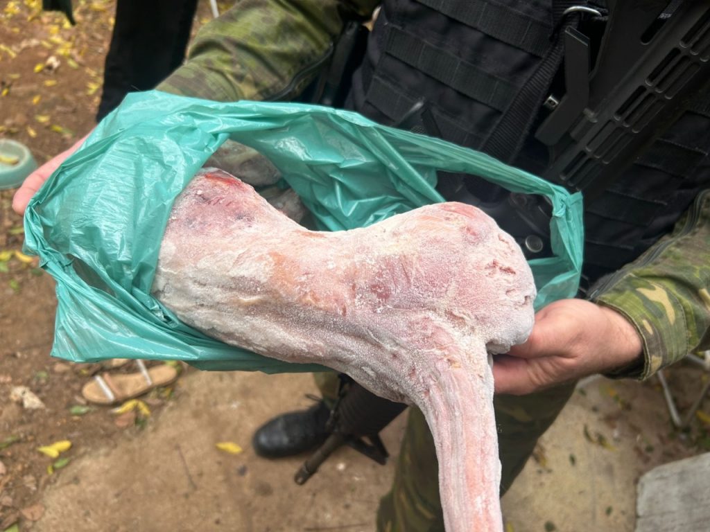 O morador foi contatado e os policiais visualizaram mais gaiolas, que resultaram na apreensão de outros dois pássaros Azulão, totalizando três aves resgatadas, e mais dois apetrechos de caça. Ainda durante a busca, foi encontrada no freezer da residência uma porção de carne congelada que, após a análise preliminar e conforme laudo veterinário, foi confirmada como sendo de Quati, um animal silvestre, reforçando a denúncia de caça ilegal na região.