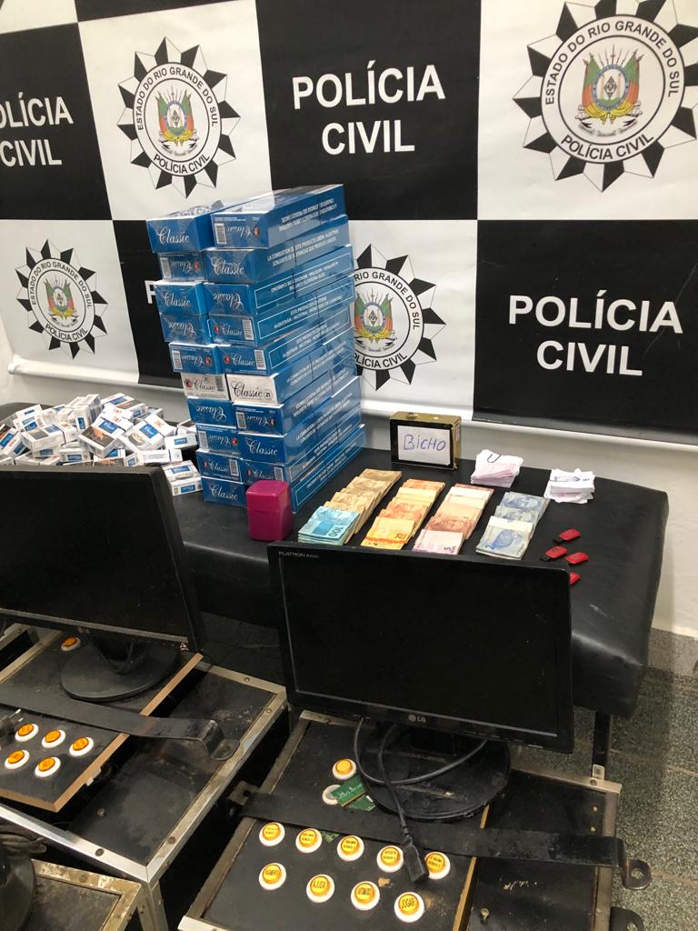 A Polícia Civil de Rolante realizou, na tarde desta quarta-feira (18), uma ação policial no Centro da cidade, efetuando buscas em estabelecimento comercial. No local, onde funciona um bar, foram apreendidas cinco máquinas caça-níqueis, mais de R$ 7 mil reais em dinheiro oriundo das apostas, anotações do jogo do bicho e produtos falsificados. O proprietário do bar foi conduzido à Delegacia de Polícia e responderá pela exploração de jogos de azar e jogo do bicho, além de crime contra o consumidor.