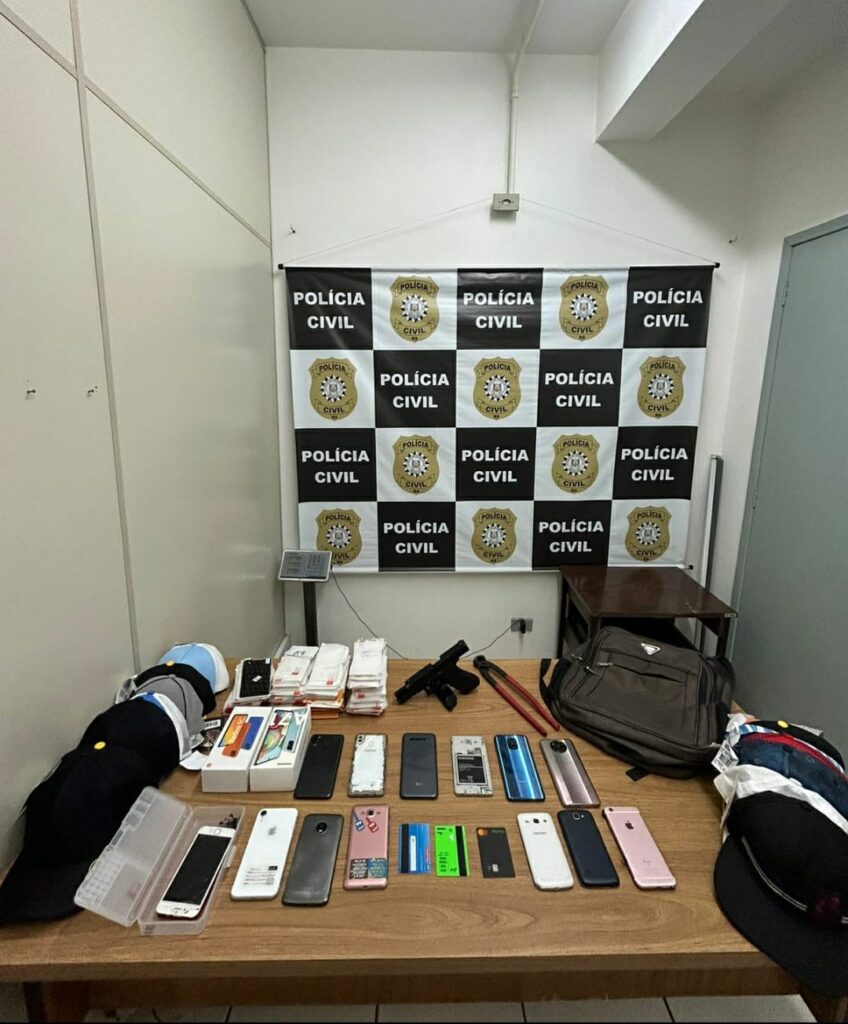 Durante o cumprimento do mandado de busca e apreensão, em Campo Bom, foram apreendidos diversos itens, como celulares, películas para celular, bonés com etiquetas de lojas, entre outros, além de um simulacro de arma de fogo (réplica de uma pistola Glock).