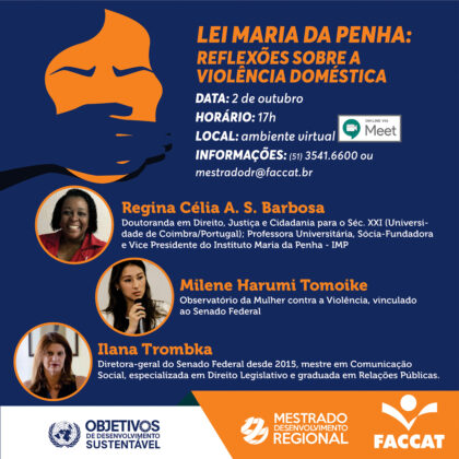 Na próxima sexta-feira, dia 2 de outubro, o Programa de Pós-Graduação em Desenvolvimento Regional (PPGDR), das Faculdades Integradas de Taquara (Faccat), realizará o painel “Lei Maria da Penha: Reflexões sobre a violência doméstica”.