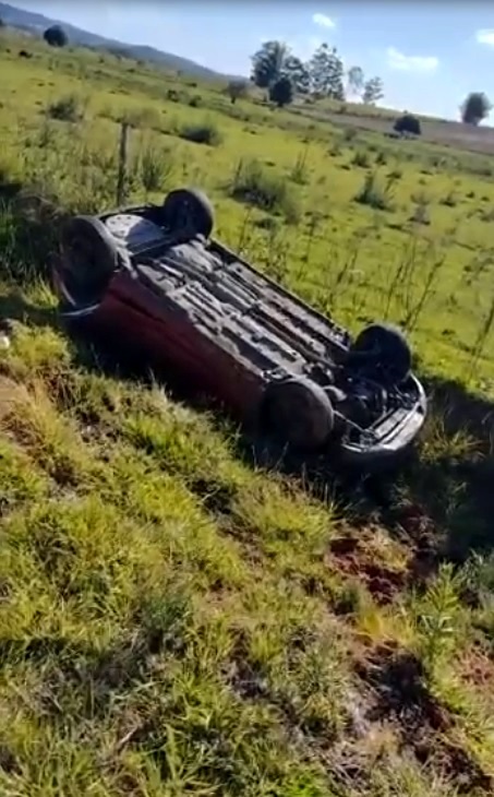 Durante o percurso, uma das motos acabou colidindo frontalmente contra um automóvel, que vinha no sentido contrário. Com o impacto da batida, o carro foi projetado para fora da pista e capotou, ficando com as rodas para cima.