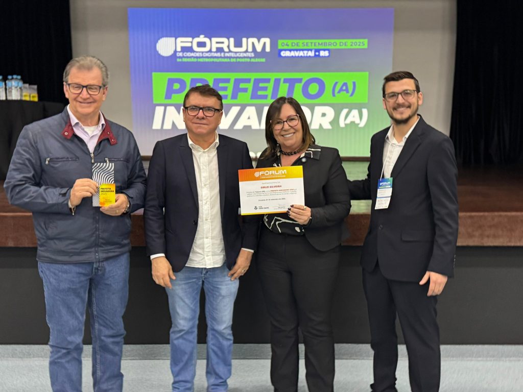 A prefeita de Taquara, Sirlei Silveira, foi agraciada nesta quinta-feira (4) com o Prêmio Prefeitos Inovadores 2025, durante o Fórum de Cidades Digitais e Inteligentes, realizado em Gravataí. A premiação destaca gestores públicos que se sobressaem pela adoção de tecnologias estratégicas e pela implementação de soluções inovadoras com impacto direto na vida da população.
