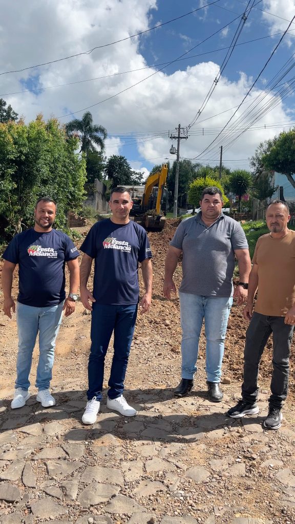 O prefeito de Parobé, Gilberto Gomes, acompanhado pelo vice Adriano Azeredo, pelo secretário de Obras Joel Vargas e pelo adjunto Paulo Hilário, visitou, nesta segunda-feira (6), as obras de pavimentação na rua Nossa Senhora de Lurdes, localizada no bairro Alvorada.