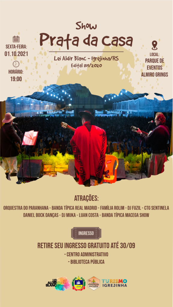 O Município de Igrejinha realizará na próxima sexta-feira (01º de outubro) o Show Prata da Casa. Em cumprimento ao edital 139/2020 da Lei Aldir Blanc no município, os artistas contemplados estarão no palco do Pavilhão 02 do Parque de Eventos Almiro Grings, a partir das 19 horas.