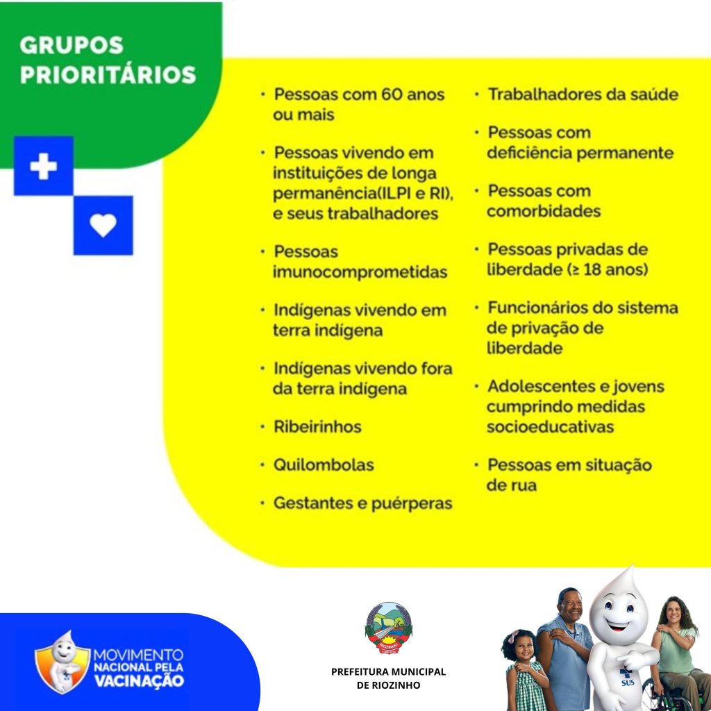 Conforme a Secretaria Municipal de Saúde de Riozinho, a vacinação contra a Covid-19 será realizada nas sextas-feiras, das 8h às 15h, na Sala de Vacinas do Posto de Saúde do Centro.