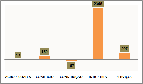Fazendo o recorte setorial, a indústria se destaca na criação de empregos na região, respondendo por 2.368 oportunidades. Já o setor de serviços aparece em segundo, com 297 empregos criados. Depois, o comércio, com 162; a agropecuária abriu 13 postos. A construção civil é o único setor com saldo negativo neste ano, com 67 vagas fechadas.