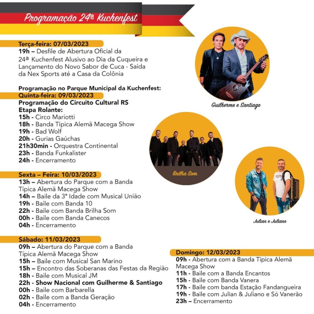 Programada para ocorrer entre os dias 09 a 12 de março, a 24ª Kuchenfest de Rolante teve suas atrações divulgadas pelos organizadores da edição deste ano: a administração municipal e a Associação de Cuqueiros e Cuqueiras de Rolante (Ascur).