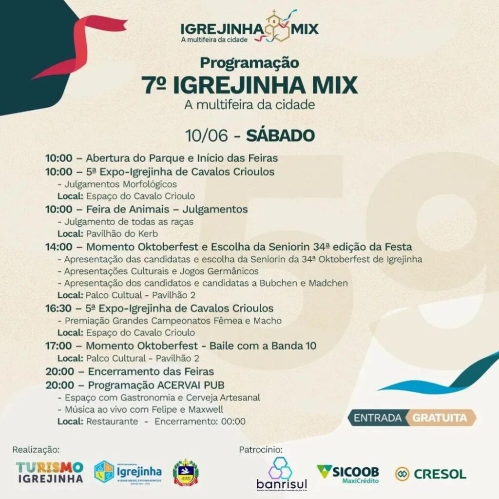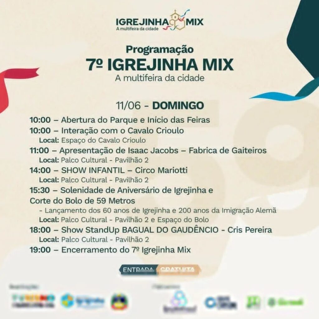 Além da apresentação do humorista Cris Pereira e de diversas outras atrações, o encerramento do 7º Igrejinha Mix terá também o tradicional corte do bolo de aniversário, momento de comemorar com todos os visitantes os 59 anos da cidade. Confira abaixo a programação dos dois últimos dias do evento.