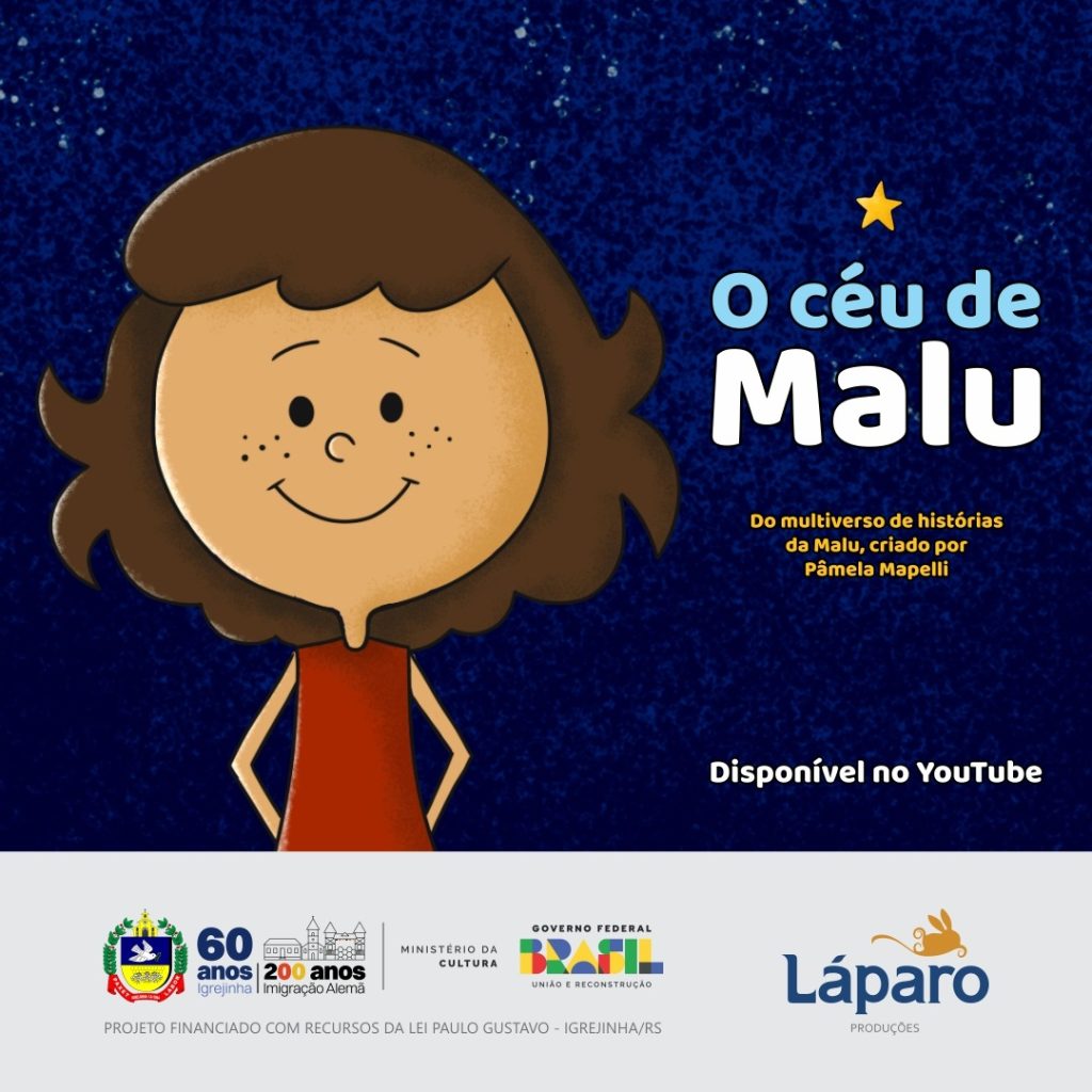 Foi lançado no YouTube o projeto cultural “O Céu de Malu”, criado por Pâmela Mapelli e financiado com recursos da Lei Paulo Gustavo em Igrejinha. A animação conta a história de Malu, uma menina criativa que transforma o teto do seu quarto em um céu estrelado, inspirado por histórias contadas por sua avó.