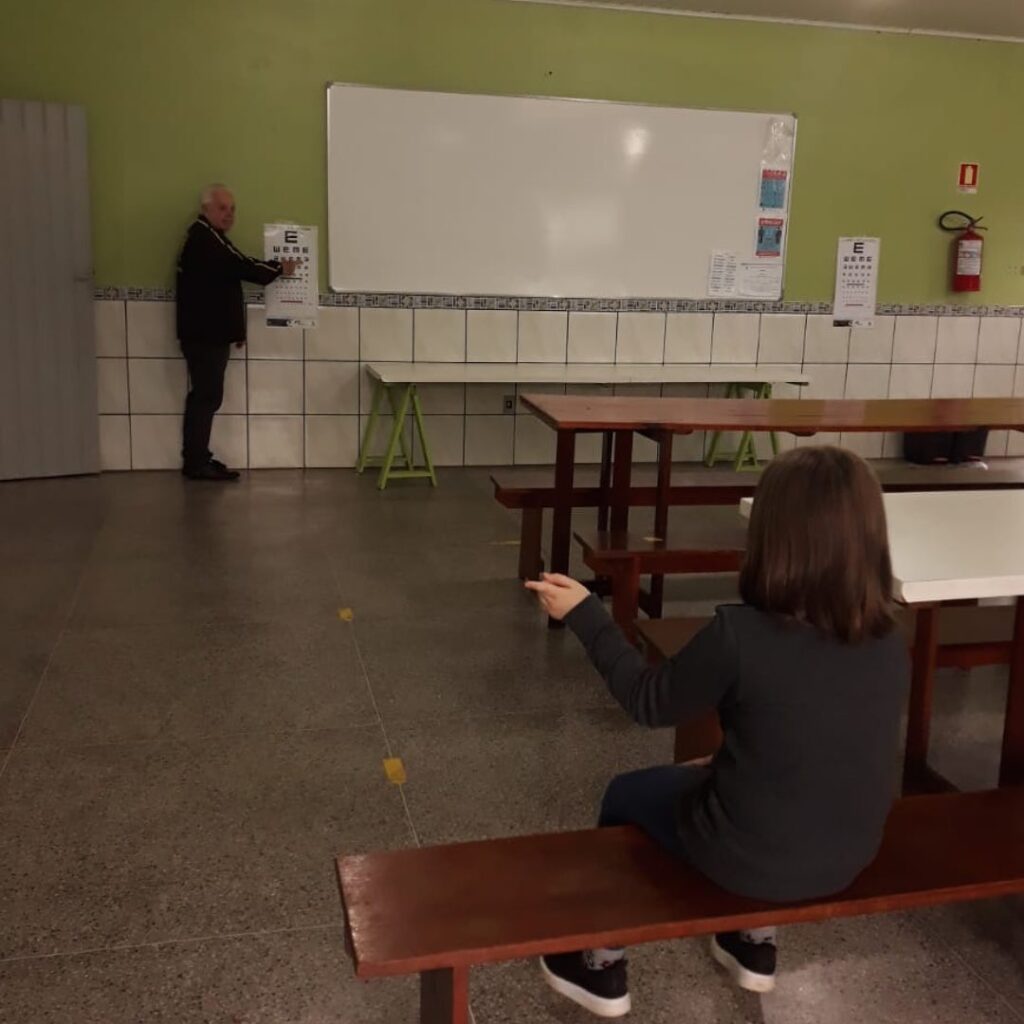 O teste ocular acontece dentro da sala de aula com os alunos do primeiro e segundo ano letivo. Os aplicadores da testagem utilizam a Tabela Snellen, que consiste na exposição de letras a uma distância de 5 metros dos alunos, para verificação da qualidade da visão.